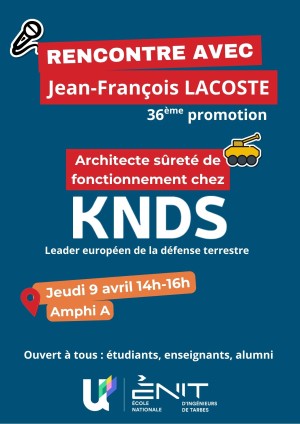 Jean-François LACOSTE, diplômé de la 32ᵉ promotion de l'ENIT et actuellement architecte sûreté de fonctionnement chez KNDS, viendra rencontrer les étudiants pour partager son parcours et son expérience professionnelle.